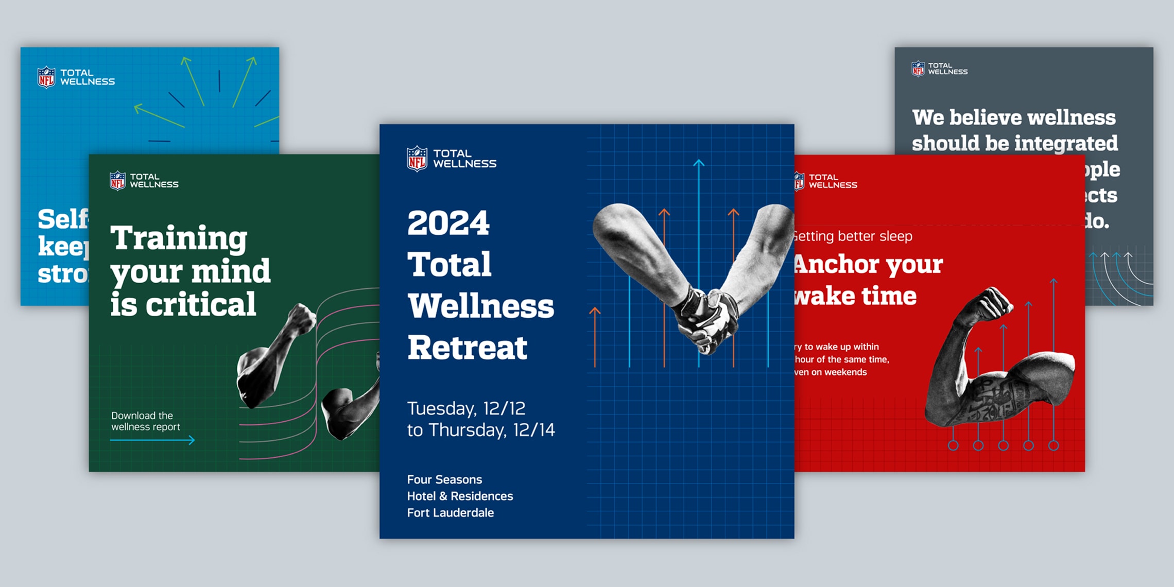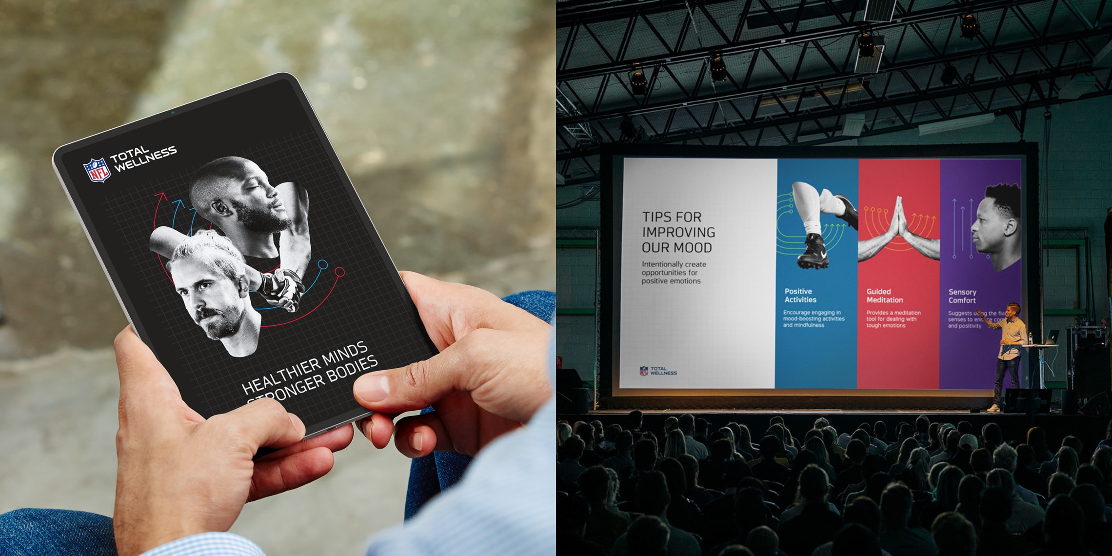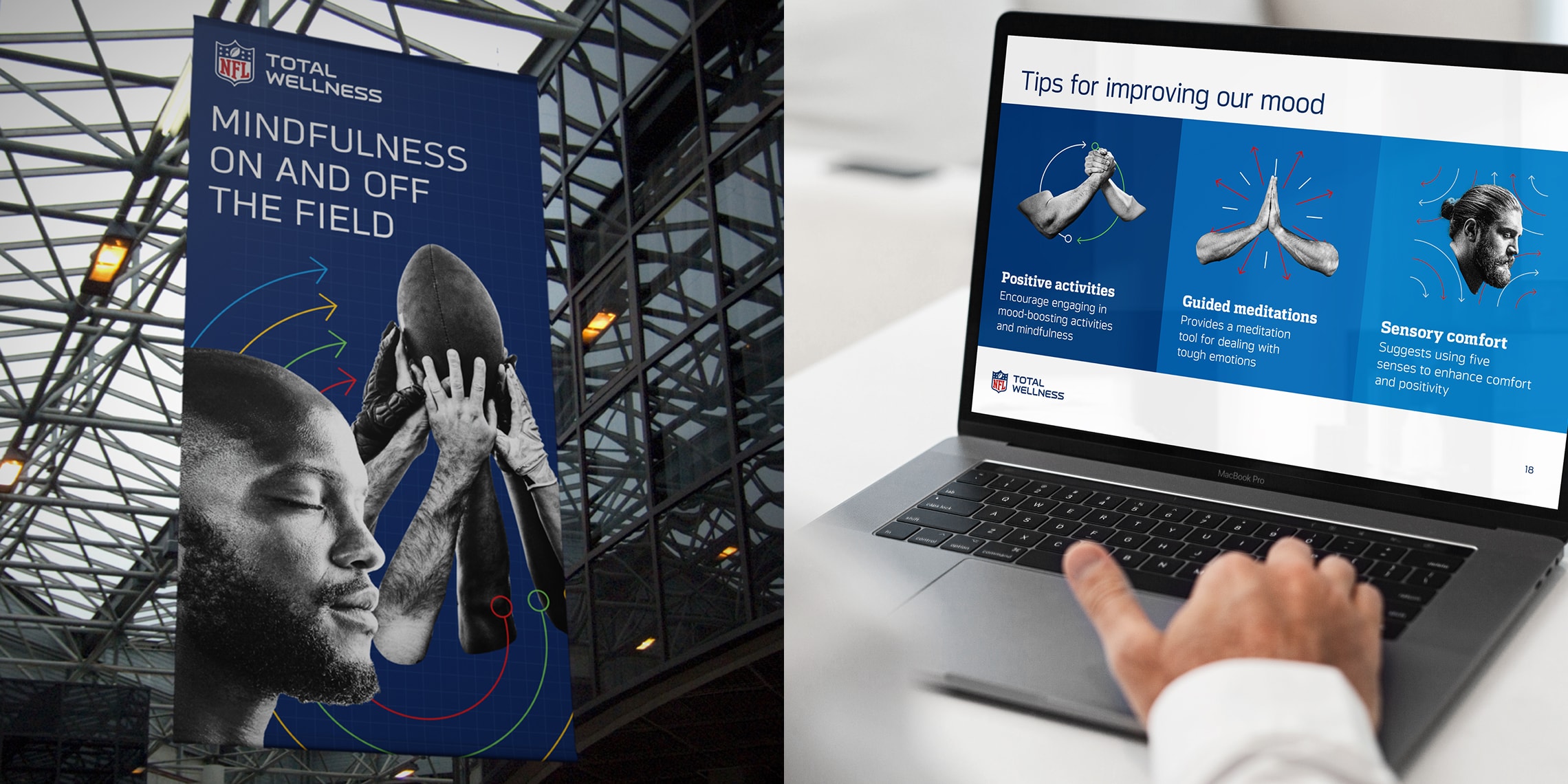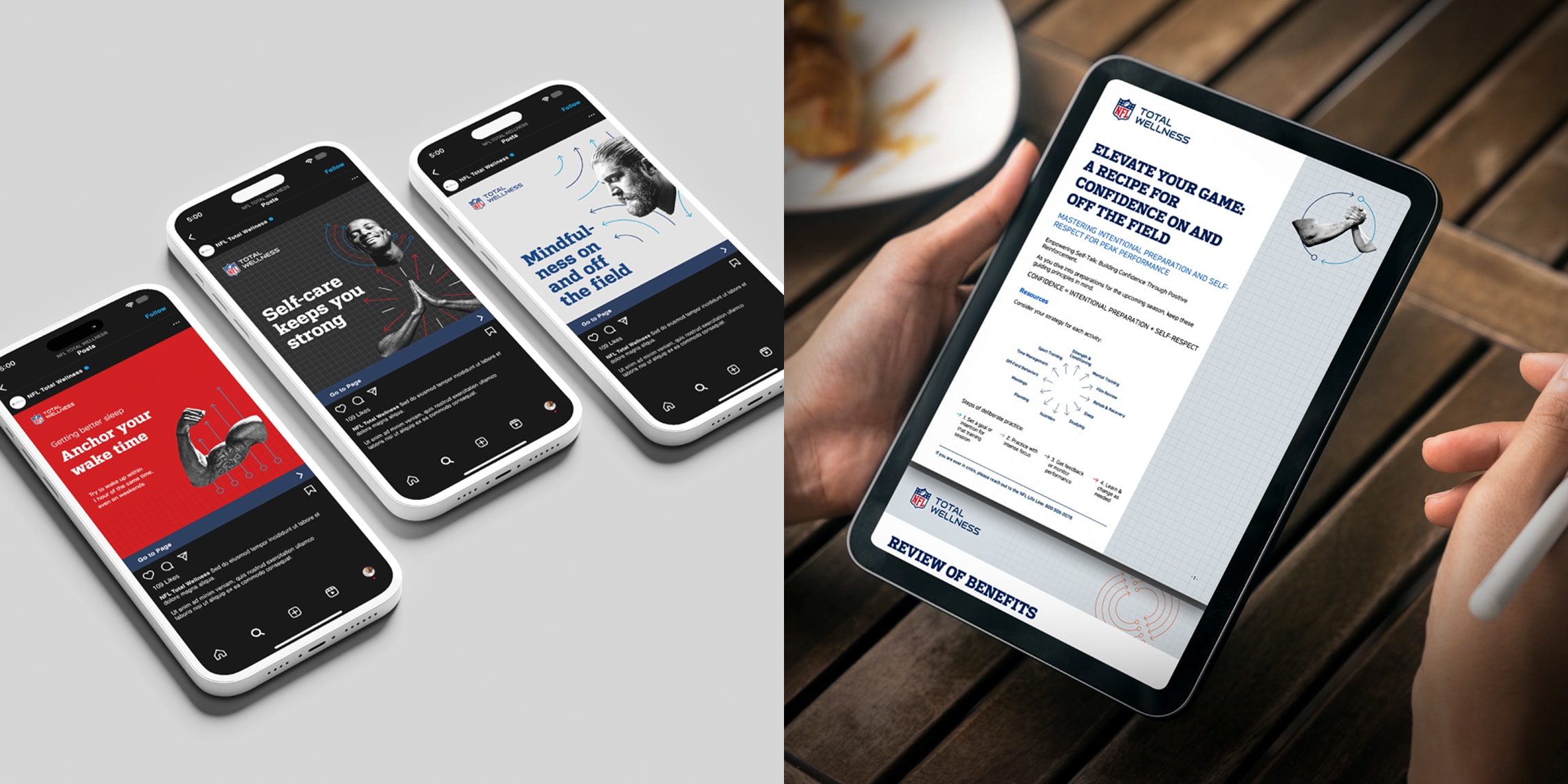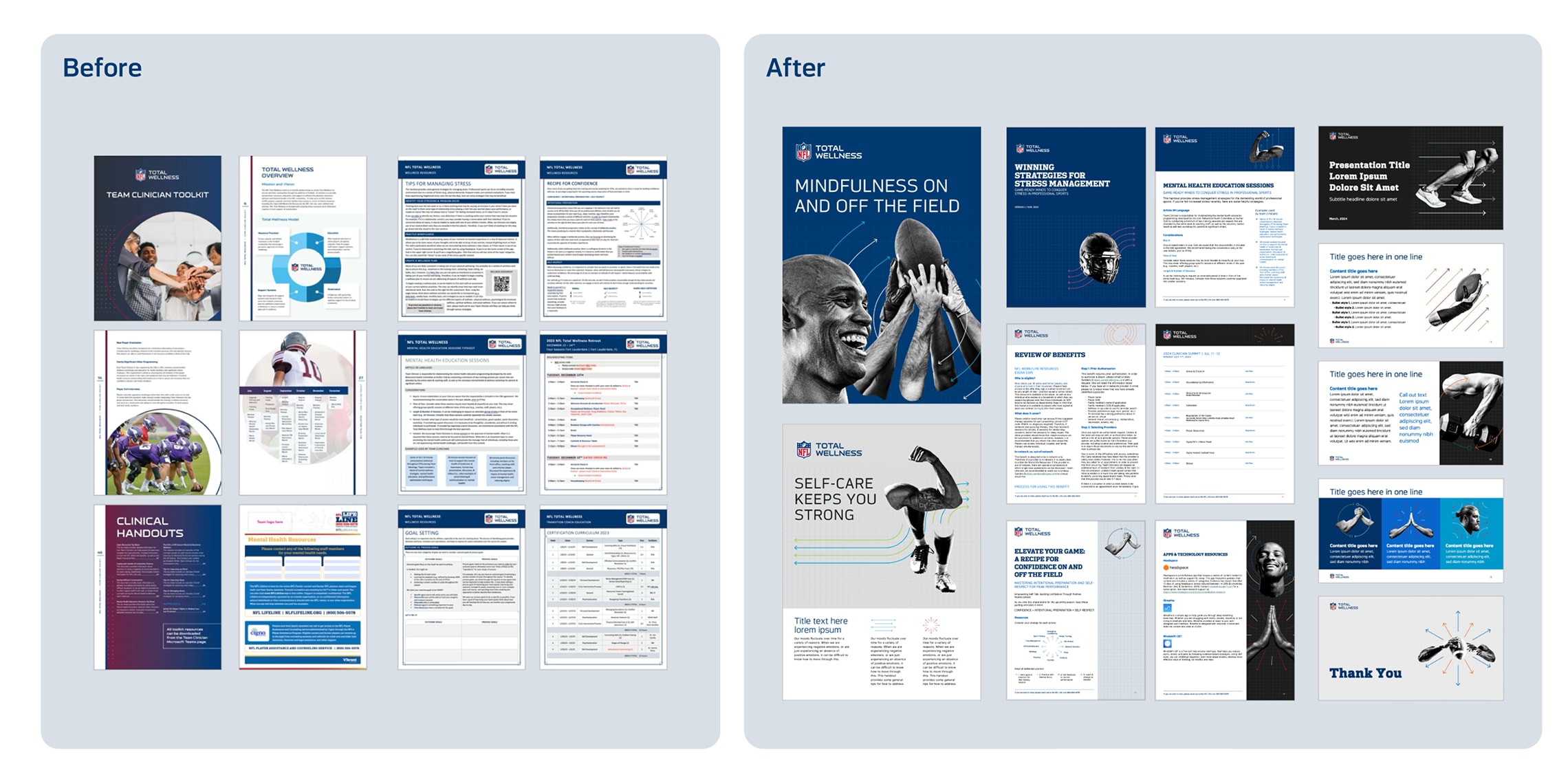 Working closely with NFL Total Wellness doctors, we developed an inventive design and content approach that maintains the NFL’s detailed brand guidelines and governance requirements. A core challenge was to create materials that resonate with two distinct audiences—athletes and team clinicians, ensuring impact and clinical credibility.
